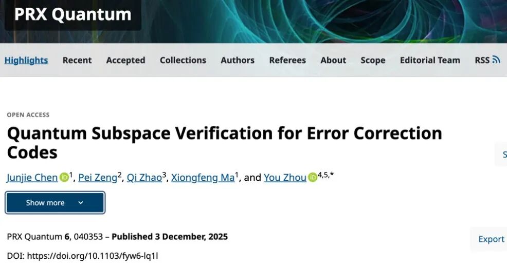 近日,复旦大学未来信息创新学院电磁波信息科学教育部重点实验室周游与清华大学、芝加哥大学、香港大学的合作者在量子态验证(Quantum State Verification)与量子纠错(Quantum Error Correction)领域取得重要进展。研究团队提出了全新的“量子子空间验证(Quantum Subspace Verification)”理论框架,实现了对量子纠错码的编码空间及逻辑魔力态(Logical Magic States)的高效且鲁棒的验证。相关成果以“Quantum Subspace Verification for Error Correction Codes”为题发表在量子物理领域权威期刊《PRX Quantum》上,周游为该论文通讯作者。同时,该成果入选2025年亚洲量子信息大会(Asian Quantum Information Science Conference, AQIS 2025)口头报告。