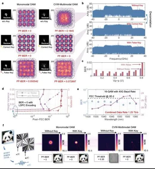 图2 超高速信息传输的太比特级光加密。(a)无密钥、正确密钥和假密钥三种不同情况下单模态OAM和CVW-多模态OAM加密的星座比较。(b)CVW-多模态OAM中三种不同场景的频谱比较,展示了纯信号和混合信号的去相关。(c)CVW-多模态OAM和CVW-多模态OAM在不同信号波形峰峰电压下的误码率(BER)柱状图,显示了噪声路径引入的最小影响。(d)实验显示,使用PF-BER对不同的CVW -多模态OAM组合进行隔离,表明权重方差增加和模态ED增大会导致更高的BER和虚假信息重建。(e)在8波长复用实验中,给出了40 GBaud 16-QAM信号的ROP和BER,实现了1.25 Tb/s的综合数据速率。(f)得到单模态OAM和CVW-多模态OAM的误码率空间分布,表明单模态OAM可以在不解密的情况下成功重构信息,而CVW-多模态OAM可以有效隐藏信息。