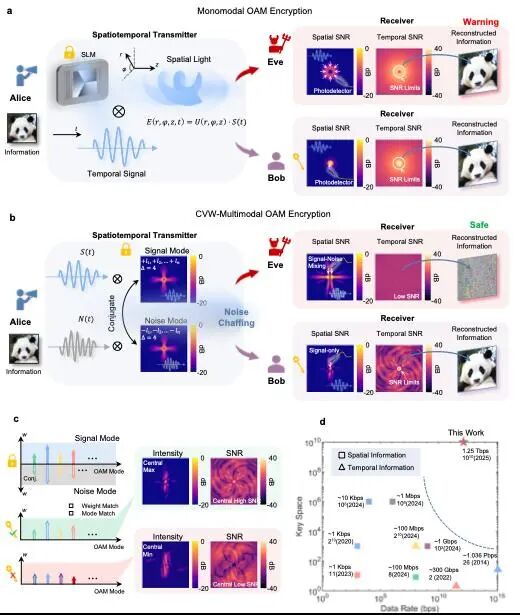 该体系通过在空间上叠加对称的共轭轨道角动量(OAM)模态,在光场中同时加载真实信号(“麦”)与随机噪声(“糠”),使得未经授权的接收者无法直接分辨时域信号,从而在物理层实现“真信号被噪声掩盖”的高安全传输。实验实现了1.25 Tbps的物理层安全光通信速率,并通过多模权重控制与神经网络生成机制将密钥空间扩展至10¹⁰维。相关成果以“Ultrahigh-speed Optical Encryption Enabled by Spatiotemporal Noise Chaffing”为题发表于国际重要期刊 Nature Communications 。