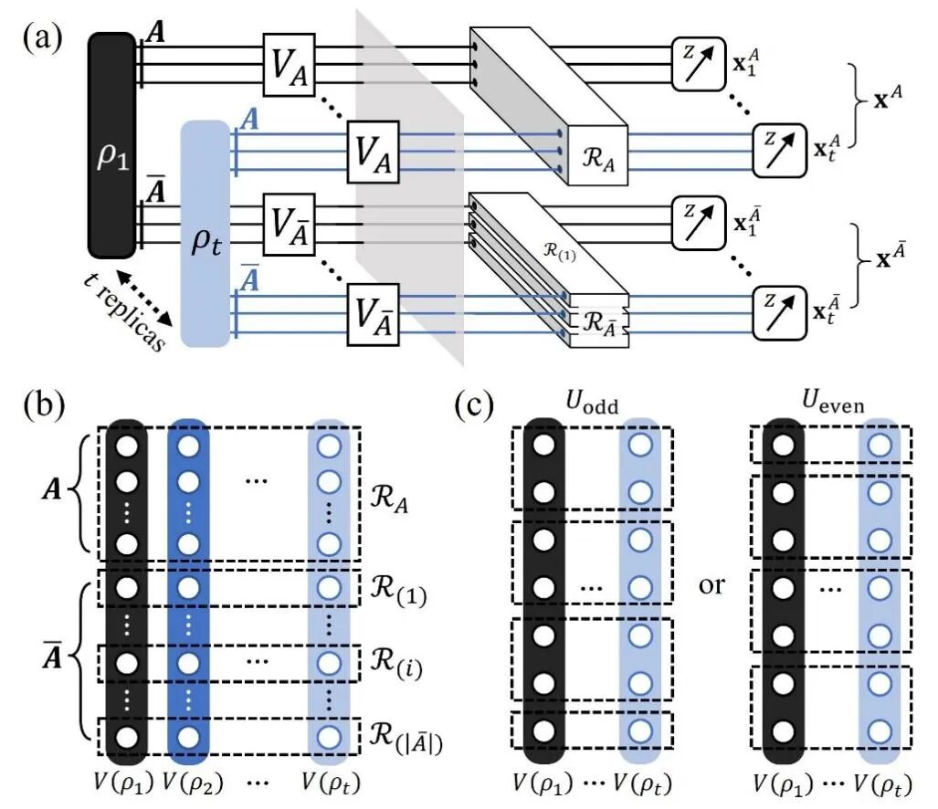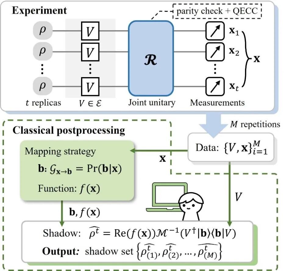 研究团队巧妙地将“阴影估计”的多任务优势与“联合测量”的纠缠力量融为一体。其核心思路如图1所示:通过对t份相同的量子态复本施加相同的随机操作与精心设计的联合纠缠测量,再结合高效而精巧的经典后处理,可直接构造出原量子态的t阶非线性函数(如ρ^t)的无偏估计量——即“经典影子”。这一过程既保留了阴影估计可同时估算多个物理量的优势,又借助复本间的纠缠测量,显著提升了对非线性性质的估计效率。