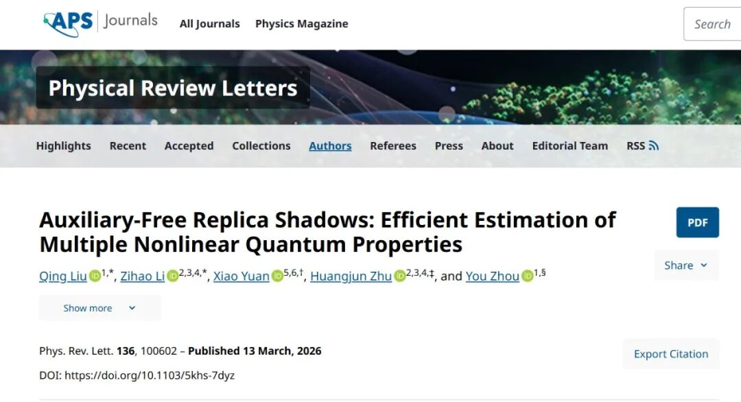 近日,复旦大学未来信息创新学院周游课题组提出了一种名为“无辅助复本阴影”(auxiliary-free replica shadow, AFRS)的突破性框架,为量子非线性函数测量难题提供了优雅而高效的解决方案。该框架无需额外硬件,采样效率实现指数级提升,从理论上彻底打破了学术界普遍认为的“辅助比特必要性”这一传统认知。相关成果以“Auxiliary-free replica shadows: Efficient estimation of multiple nonlinear quantum properties”为题,发表于《 Physical Review Letters 》,并成功入选亚洲量子信息大会(AQIS2025)、量子计算理论与实践大会(QCTiP2025)、量子技术与机器学习大会(QTML2025)等国际会议的口头报告。
