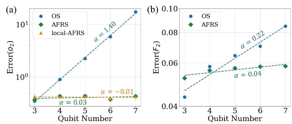 图3. 数值模拟结果:相比传统阴影层析(OS)方案,AFRS及局域AFRS在估计量子态非线性性质时,采样复杂度展现指数级优势