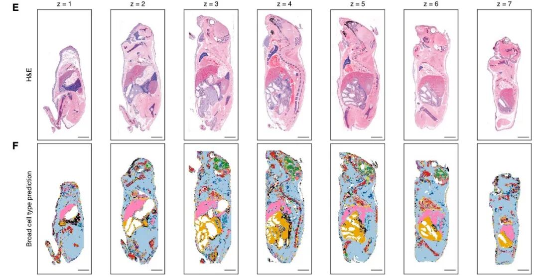 为实现单细胞分辨率的精准分析,团队整合了包含5900 万个单细胞、466 项单细胞 RNA 测序研究的海量参考数据集,在小鼠全身截面约 500 万个细胞核中,成功识别出379 种细胞类型,首次实现全小鼠体尺度的单细胞分辨率空间定位。