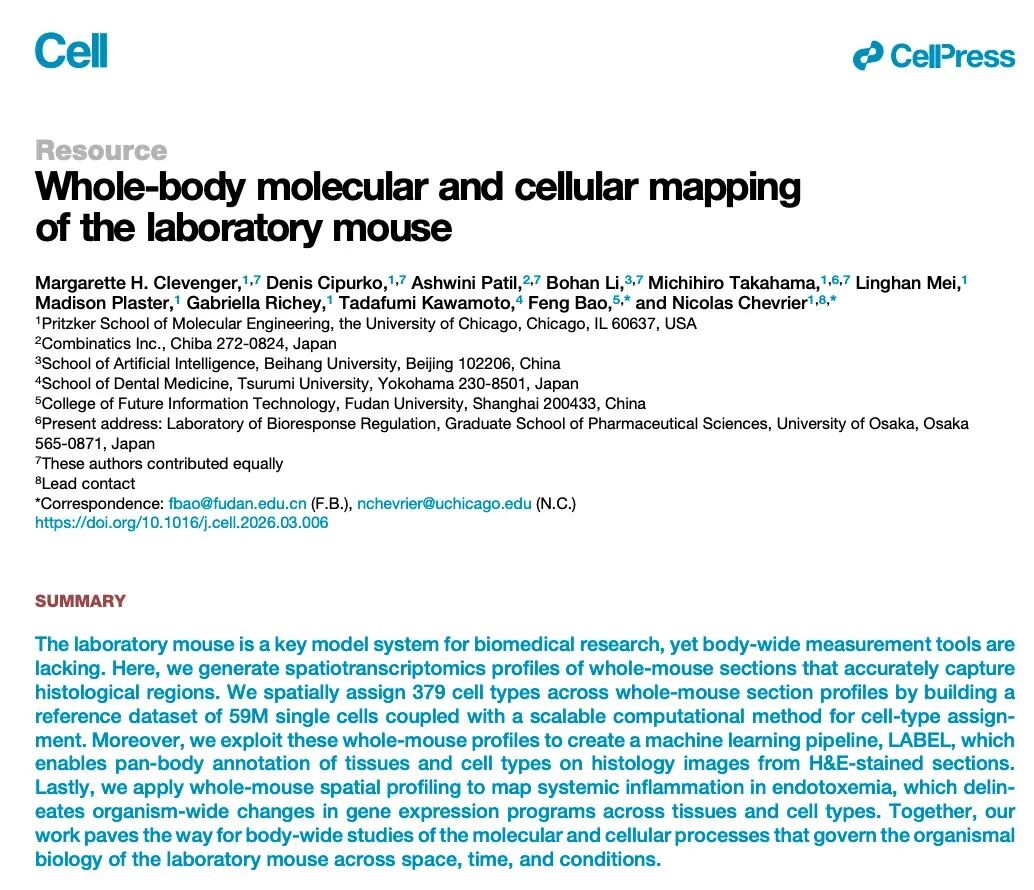 为打破这一困境,该团队从实验技术、计算方法与人工智能应用三大领域跨学科协同推进,团队首次将单细胞分辨率的分子分析拓展至全机体尺度,不仅建立了覆盖小鼠全身的分子与细胞图谱,更探索了 AI 方法在大规模生物图像解析中的应用路径,为健康与疾病条件下的全身尺度系统性生物学研究,奠定了全新的技术和数据基础。成果发表于最新国际顶级期刊《细胞》(Cell)。芝加哥大学是该成果的第一作者单位,复旦大学为该成果的共同通讯作者单位。