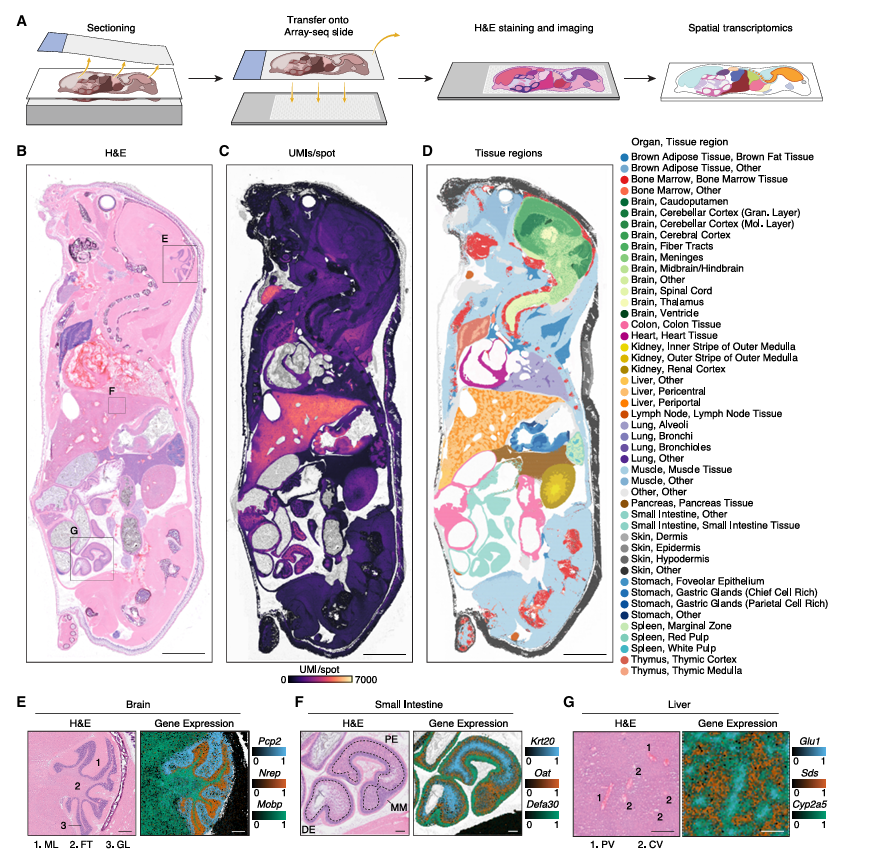 研究团队自主开发了适用于整只小鼠切片的大尺寸空间转录组平台 Array-seq,将整体小鼠冷冻切片精准铺展于约 11 平方厘米的载片上,设置约 97 万个检测位点,实现了单次实验覆盖小鼠全身 16 个器官系统的技术突破。